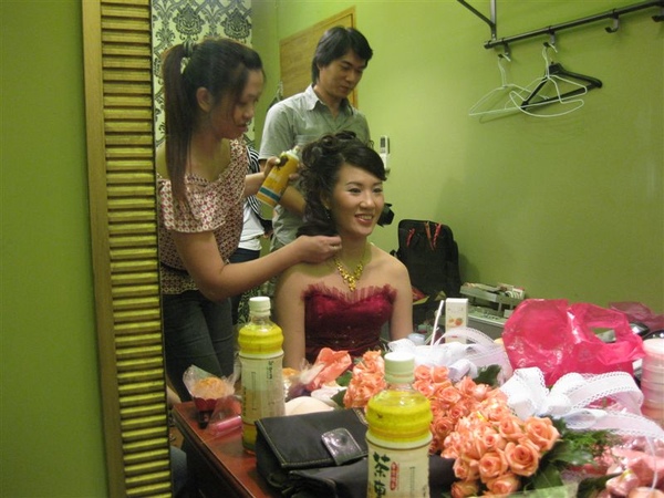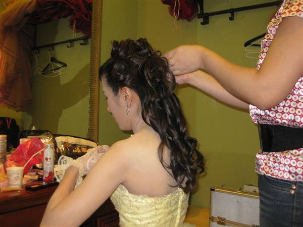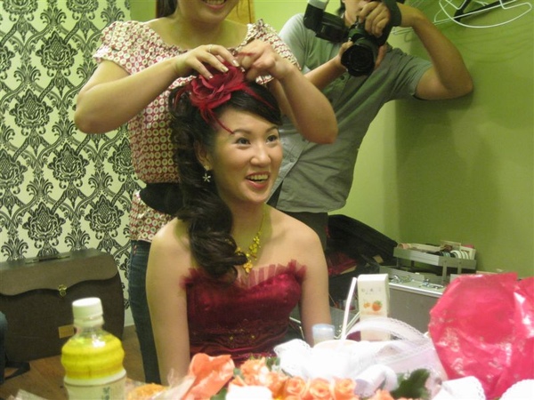 戴上跟禮服相配的頭花,嗯~水水的敬酒造型,就快出爐了哦!!!!